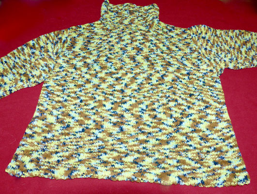 Dieser Pullover ist mit einem dickeren Garn gestrickt und daher eher für den Winter gedacht. Dennoch ist er sehr leicht. Auch hier haben Bund und Ärmel den Abschluss mit Mäusezähnchen.