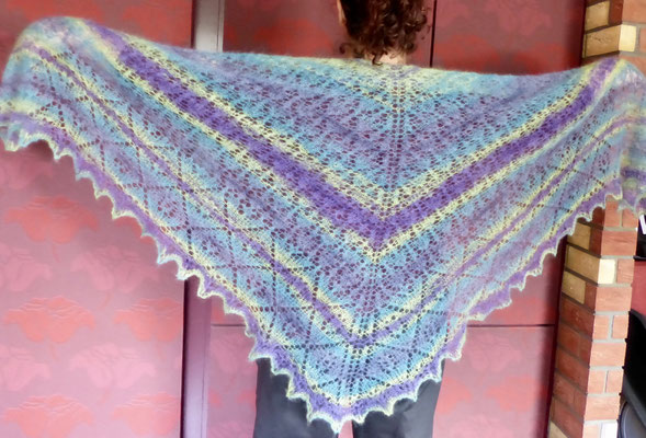 Die Farben blau bis weiß und als Dreieckstuch, 'Stola' oder Schal nutzbar.